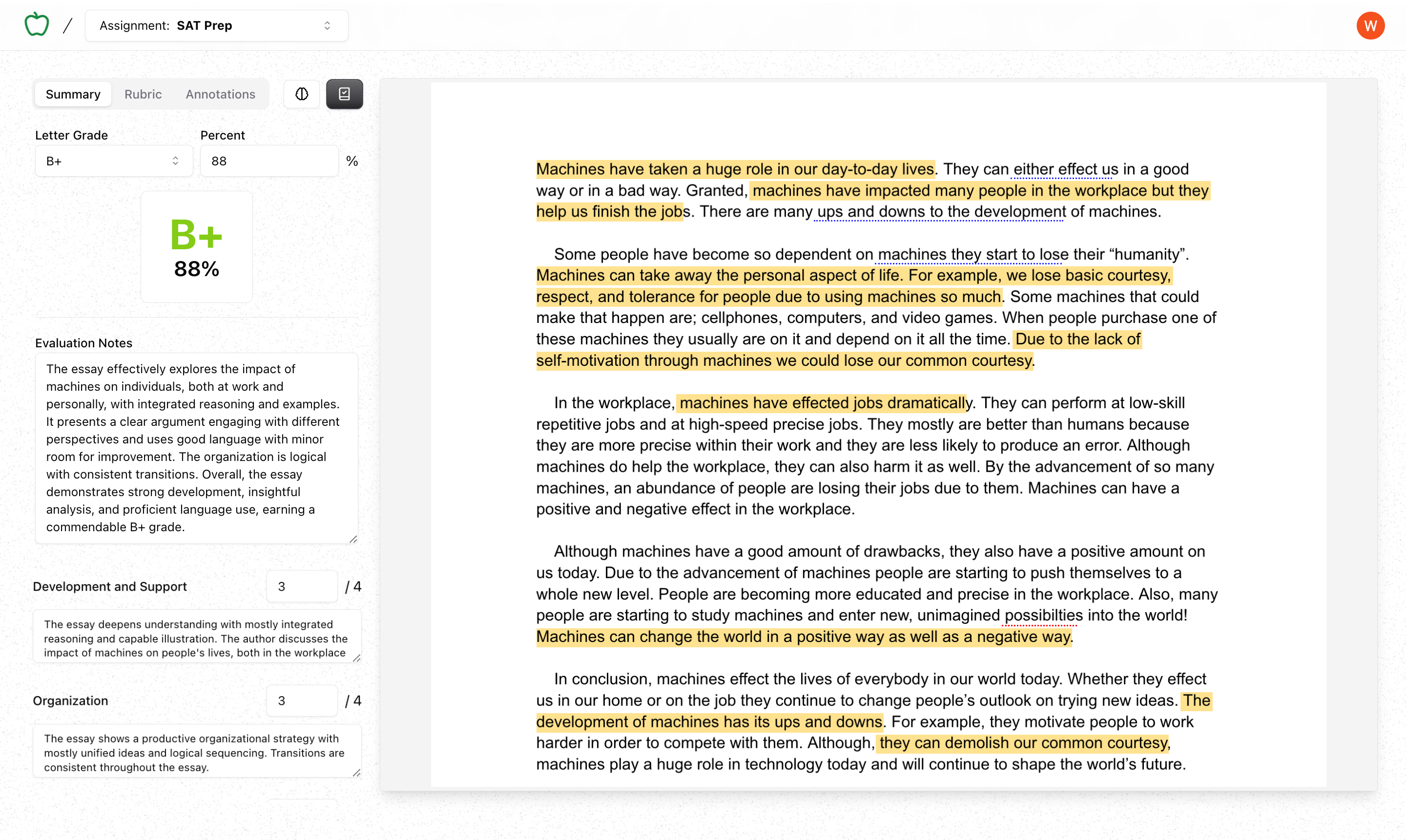 Grade essays automatically. As you use the system, our AI learns YOUR grading style. - Full Control